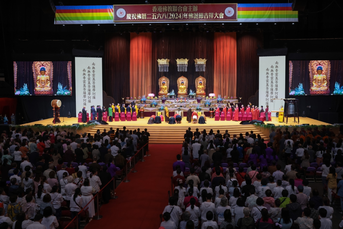 香港新聞網5月15日電(記者謝光磊)5月15日為農曆四月初八佛誕日,香港佛教聯合會即日起至17日在紅磡體育館舉行系列佛誕慶祝活動,首場“浴佛大典暨‘祝福祖國 祝福香港’吉祥法會”為活動拉開序幕。今年法會亦為“止戰息爭,世界和平”誦經,將於16日舉行金剛經吉祥誦經法會,匯聚大眾願力,誠心為一切戰爭災民及罹難者誦經。活動并設有佛學講座、傳燈法會、萬人皈依和懺摩法會等。紅館戶外廣場還有公眾浴佛區、祈福區、抄經區及慈善籌款攤位。