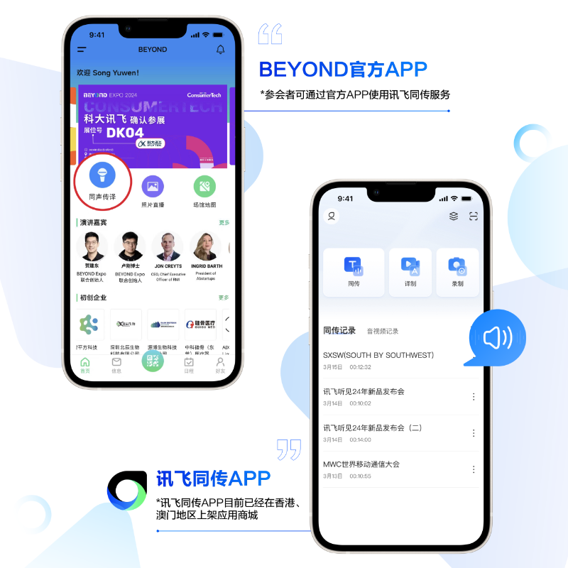 訊飛同傳APP、訊飛聽見APP香港及澳門地區上線 BEYOND活動前夕,訊飛同傳APP、訊飛聽見APP已在香港澳門地區上架手機應用商城,用戶可體驗高效AI同聲傳譯和AI語音轉寫服務。訊飛同傳APP目前支援中文和15種語言的同傳互譯。(訊飛同傳APP支持語種:中文、英語、日語、韓語、俄語、法語、西班牙語、阿拉伯語、德語、葡萄牙語、越南語、泰語、義大利語、粵、維、藏)