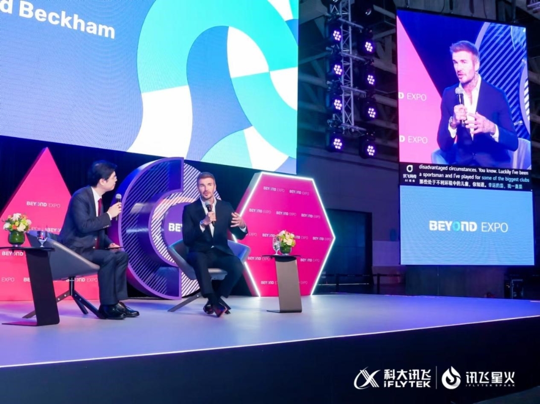 圖:貝克漢姆接受採訪時訊飛同傳右側提供同傳翻譯服務 訊飛同傳嵌入官方APP,秒變會務隨身翻譯專家 BEYOND EXPO作為全球科技創新文化交流平臺,參會者來自數十個不同的國家和地區,為促進不同語言地區參會人員的無障礙交流,BEYOND官方聯合科大訊飛將訊飛同傳(iFLYTRANS)嵌入BEYOND APP中,參會人員可在大會演講活動中通過“同聲傳譯”功能觀看AI翻譯的文字,並可掃碼收聽AI語音合成的翻譯內容。BEYOND APP目前支援中文和8種語言的同傳互譯(英日韓俄德意法西)。