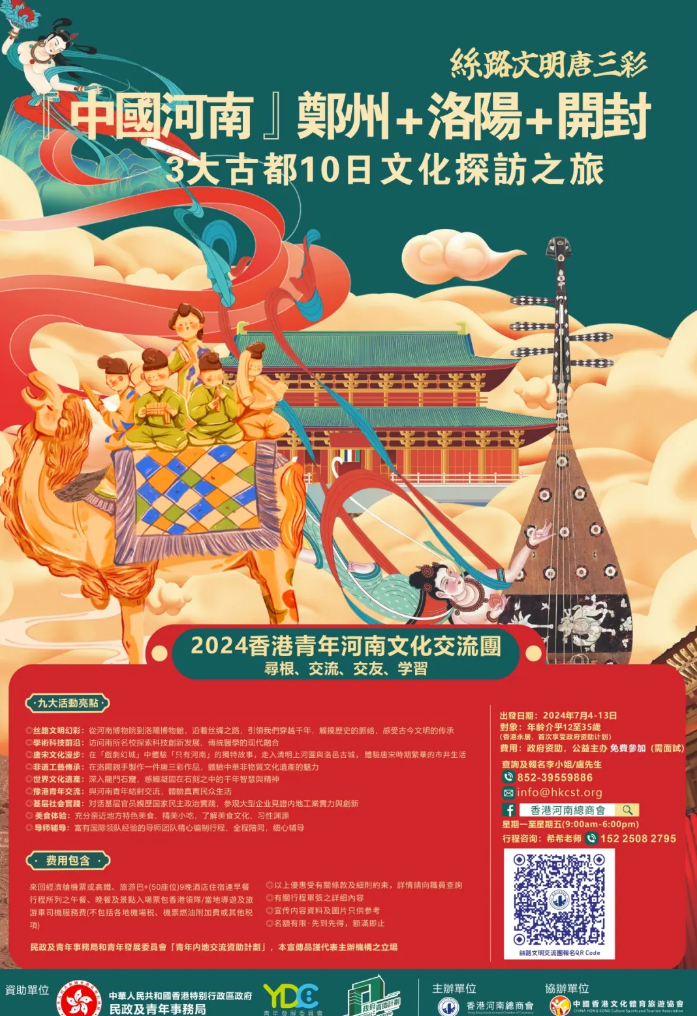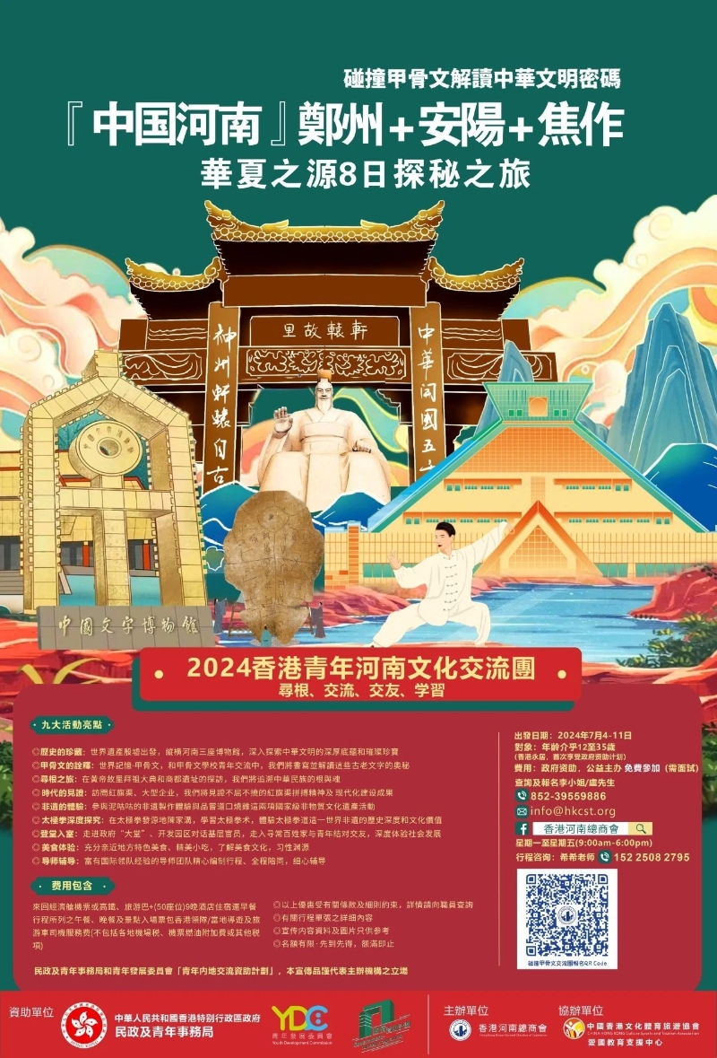 活動費用:政府資助,香港河南總商會公益主辦,免費報名,費用$0,只需繳納按金$1000 ,活動全部完結後將退回按金$1000 。 出發日期:2024年7月4-7月13日(擬定) 年齡介乎:12-35歲青年,共40名。 報名鏈接:https://forms.gle/ZMcSZ8tnogDy9C297 香港永居,香港居民在港就讀全日制課程可參加兩個項目。 碰撞甲骨文,解讀中華文明密碼——2024香港青年河南文化交流團