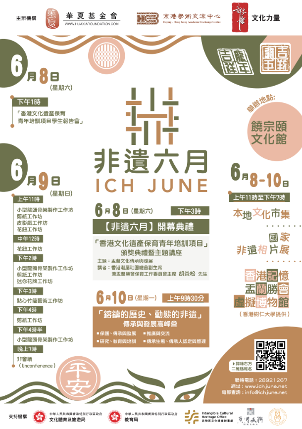 作為本地文化盛事,“非遺六月”系列活動冀可加強香港“非遺”文化傳承和教育的力度,對接祖國推廣“非遺”和中華文化的政策,從而為香港構建文化自信,凝聚民族文化意識,並為“非遺”研究學者提供學術平台。為此大會將於6月9日舉辦多個工作坊,並於6月10日舉行“鎔鑄的歷史.動態的非遺”傳承與發展學術高峰會。(完) 【編輯:譚暢】