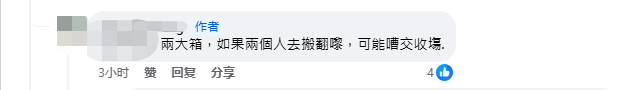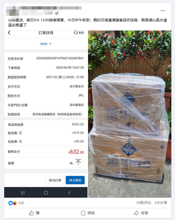 臉書截圖 帖文一經發出,立刻引起不少同為“山姆粉絲”的關注。在下方評論區,有網友直言,79.5元運費“可以接受”,不僅省下了往返深圳的交通費,更免去了親自搬運的辛苦。對此,發帖者回覆時笑言“兩大箱,如果兩個人去搬回來可能會吵架收場”。
