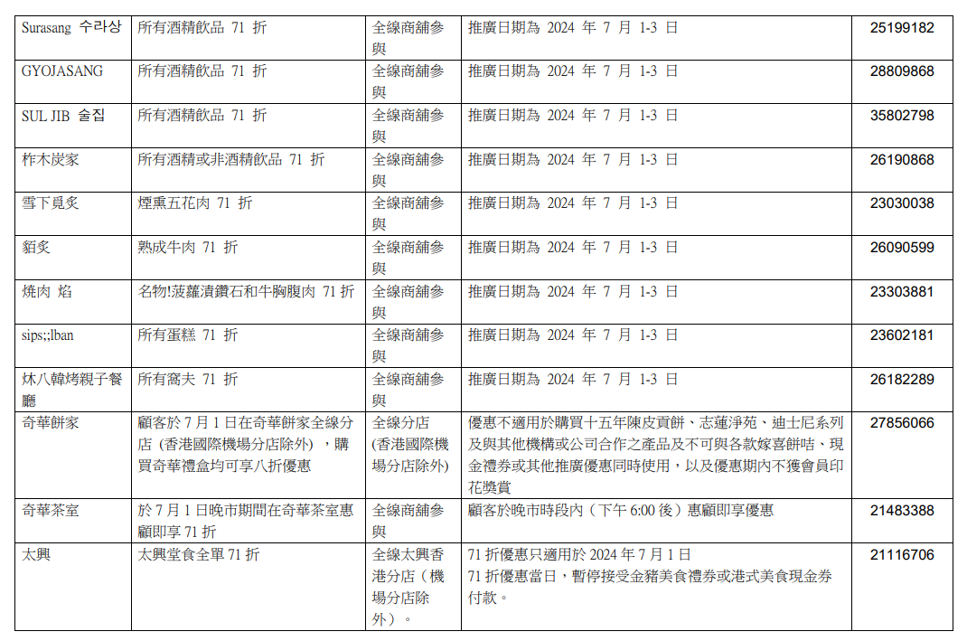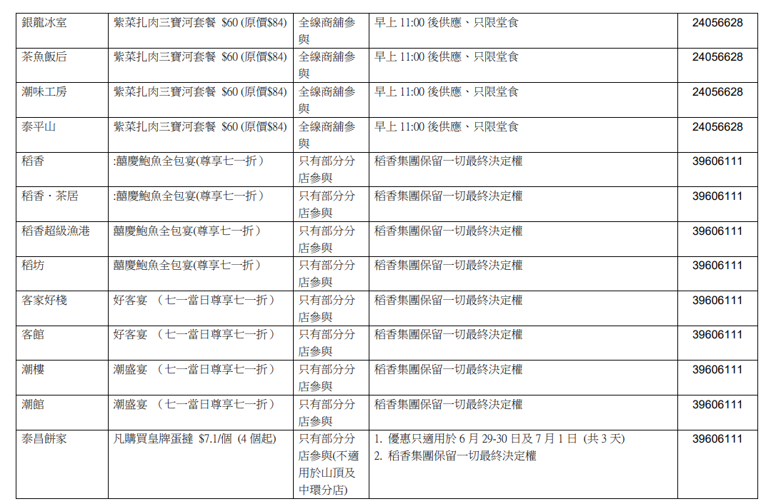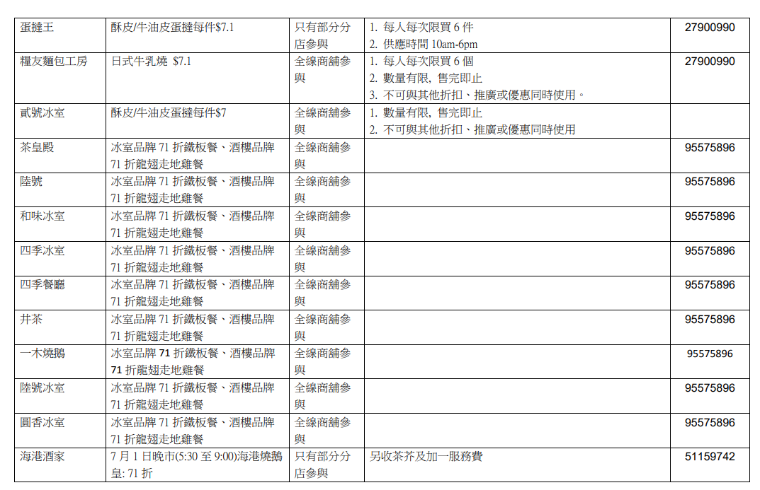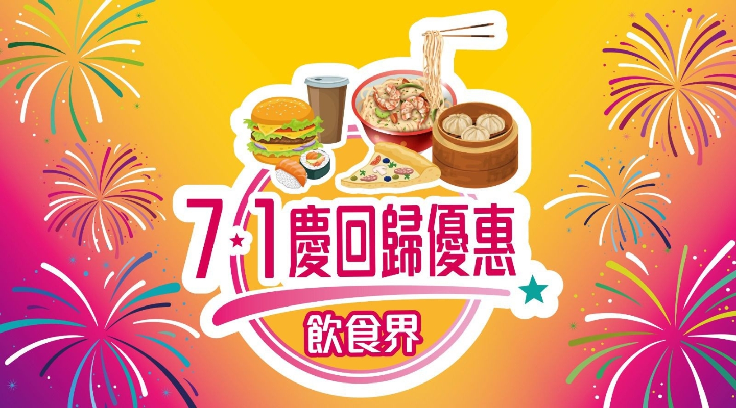 7月1日當天,將有超過2000家食肆推出優惠活動,指定菜式或餐飲品更有七一折優惠,其中包括大型餐飲集團美心、大家樂、大快活、陶源、富臨等連鎖餐廳,以及麥當勞、肯德基、Pizza Hut等。詳細名單點擊這裡:https://www.hksar27.gov.hk/public/pdf/special-offer/SO-CI.pdf