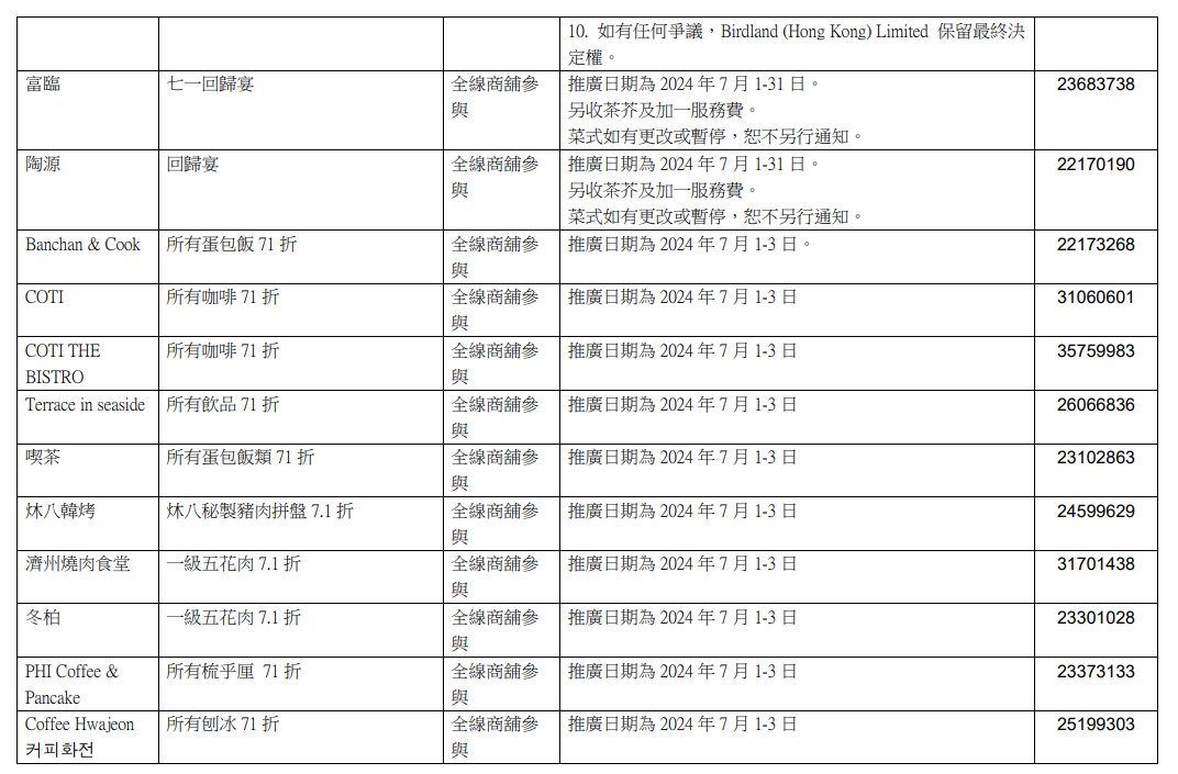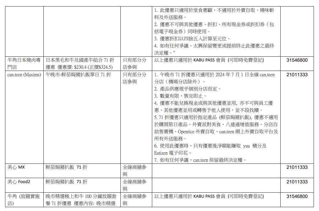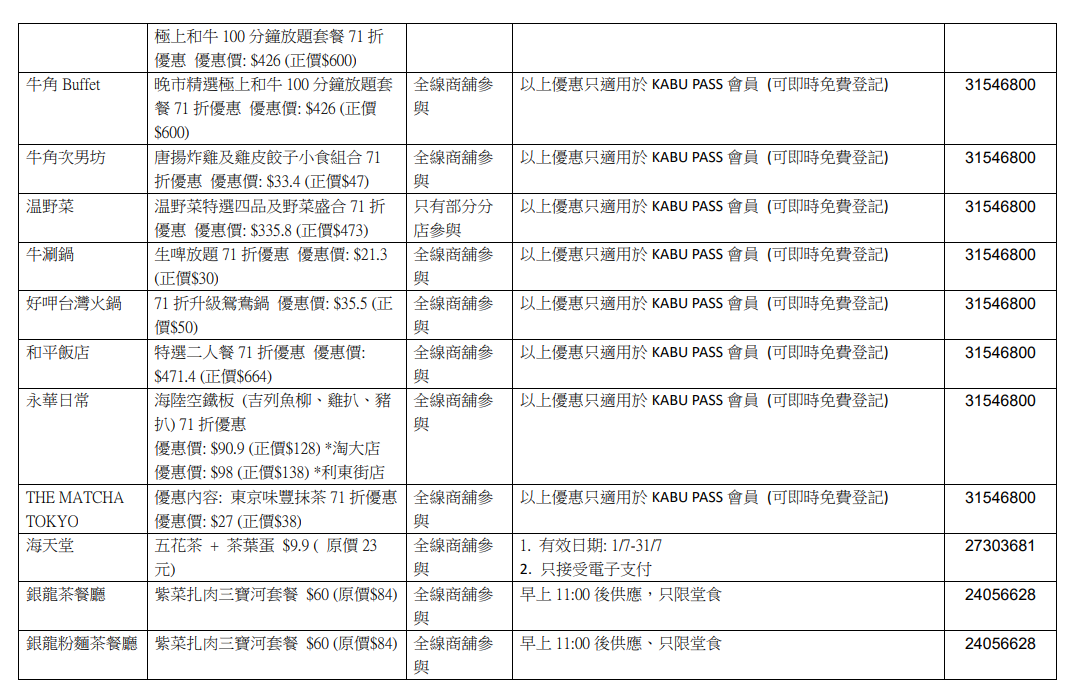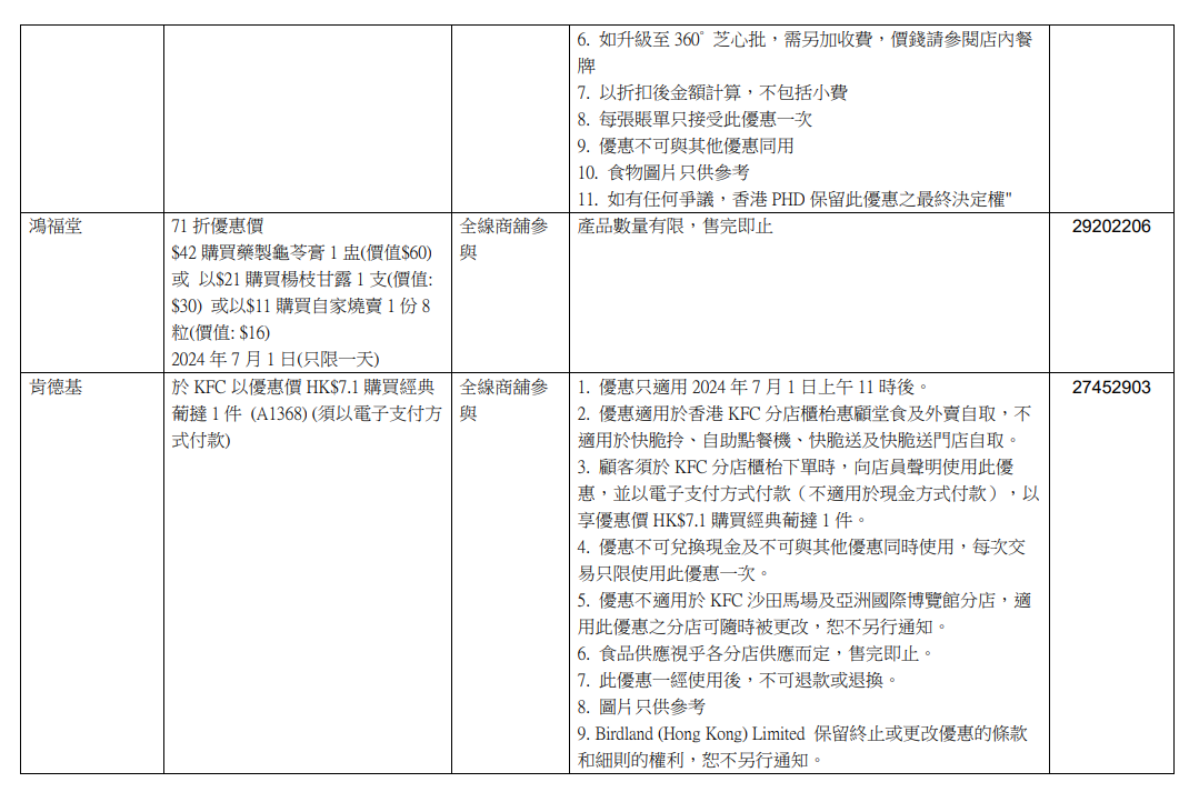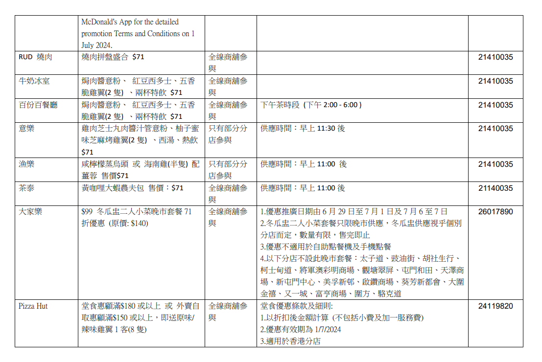 7月1日當天,將有超過2000家食肆推出優惠活動,指定菜式或餐飲品更有七一折優惠,其中包括大型餐飲集團美心、大家樂、大快活、陶源、富臨等連鎖餐廳,以及麥當勞、肯德基、Pizza Hut等。詳細名單點擊這裡:https://www.hksar27.gov.hk/public/pdf/special-offer/SO-CI.pdf