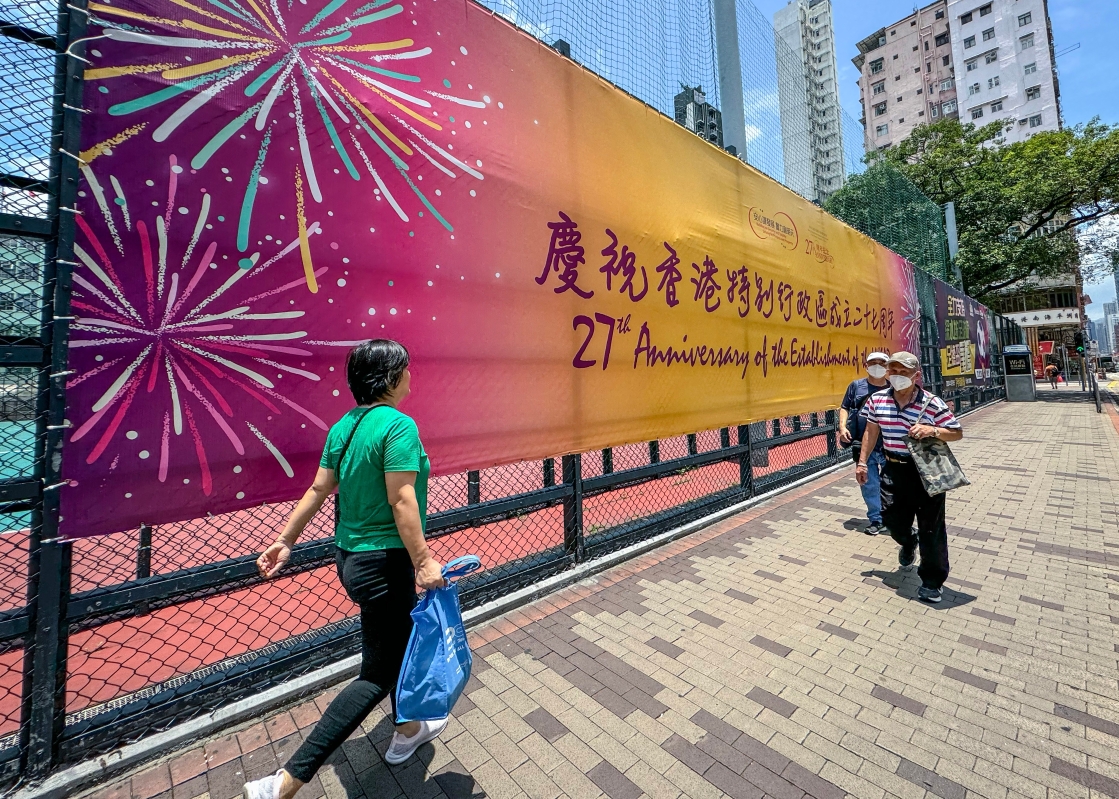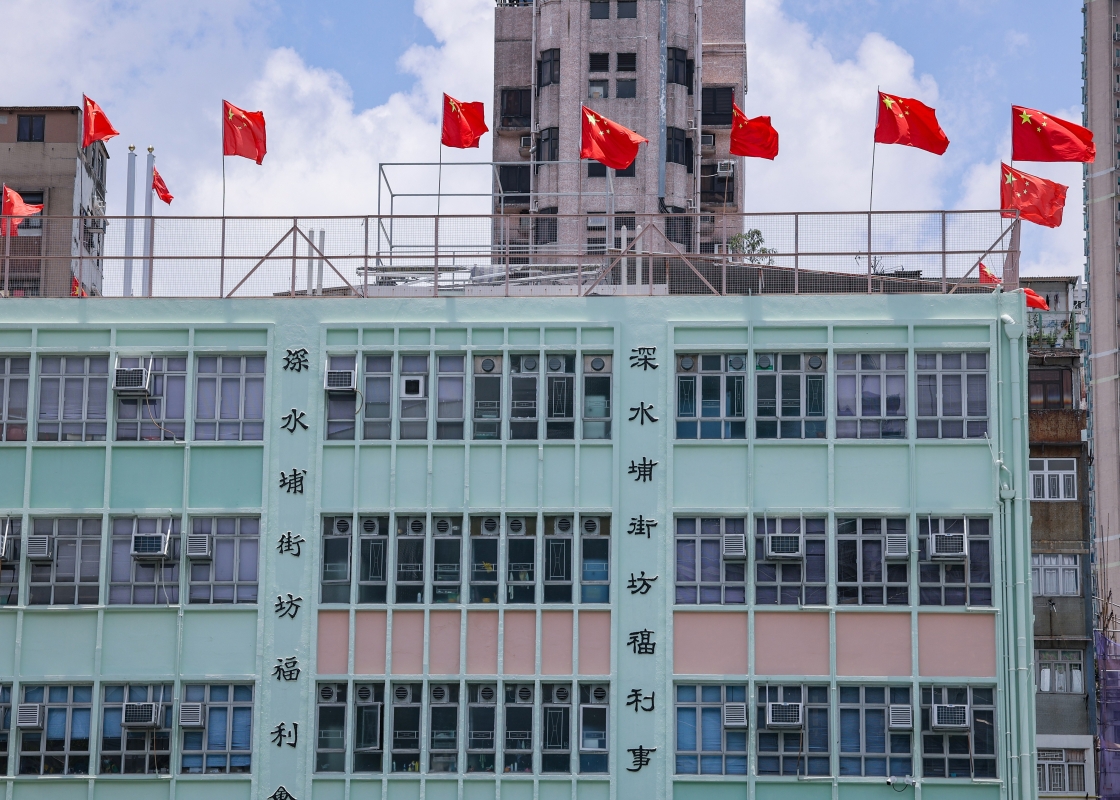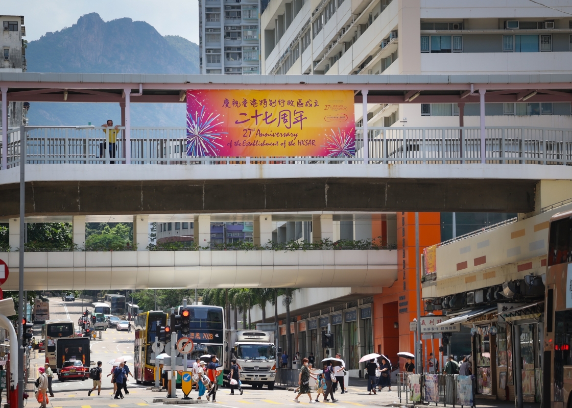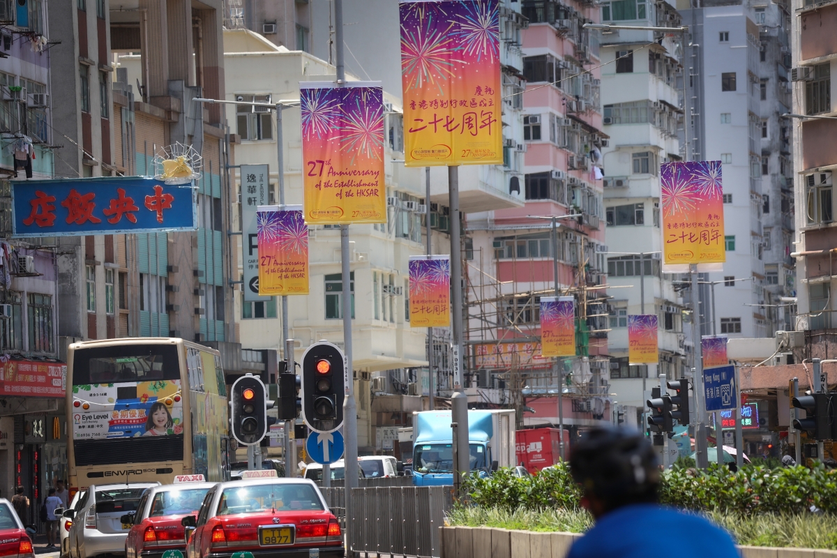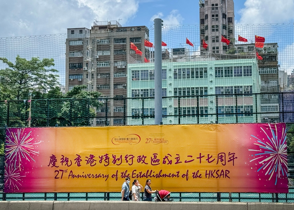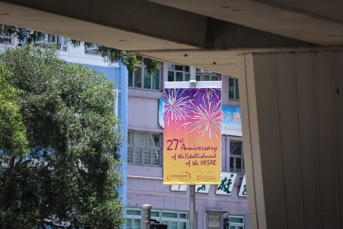 香港新聞網6月26日電 (記者 徐文峰 )近日,香港全城裝飾一新慶祝回歸祖國27周年。6月26日,香港深水埗街頭掛滿慶祝回歸祖國27周年、特別行政區成立27周年的宣傳標語,為傳統舊區添一抹暖色,注入朝氣。