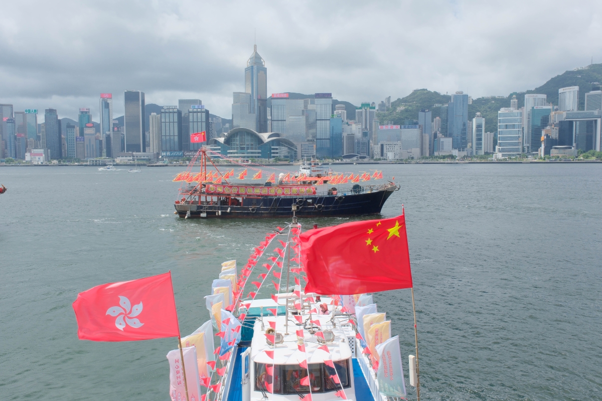 香港新聞網7月1日電(記者許其皓)7月1日,香港漁民團體聯會組織27艘大漁船在維多利亞港巡遊,慶祝香港回歸祖國27周年。在尖沙咀文化中心、天星碼頭一帶,大批市民在尖沙咀海濱揮舞著中華人民共和國國旗和香港特區區旗,慶祝香港回歸祖國27周年。