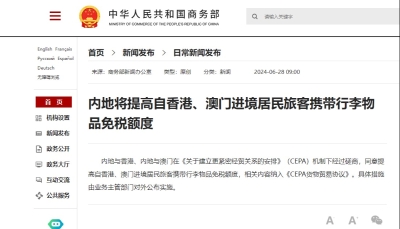 7月1日起自港澳入境內地居民旅客免稅額提高至合計人民幣15000元