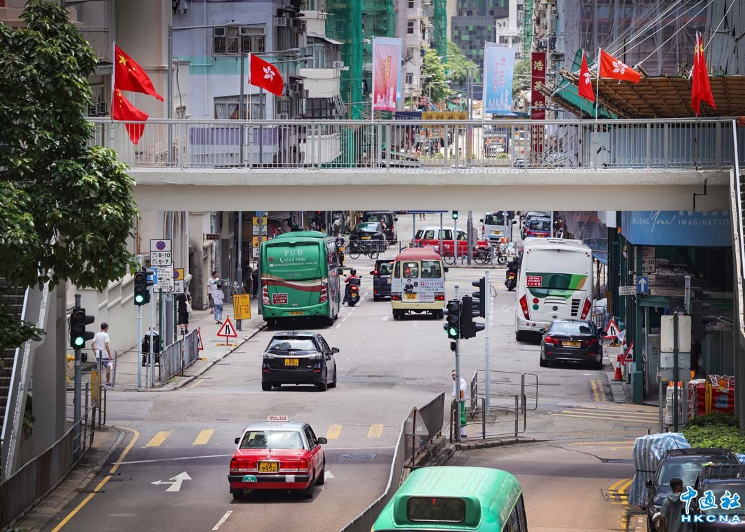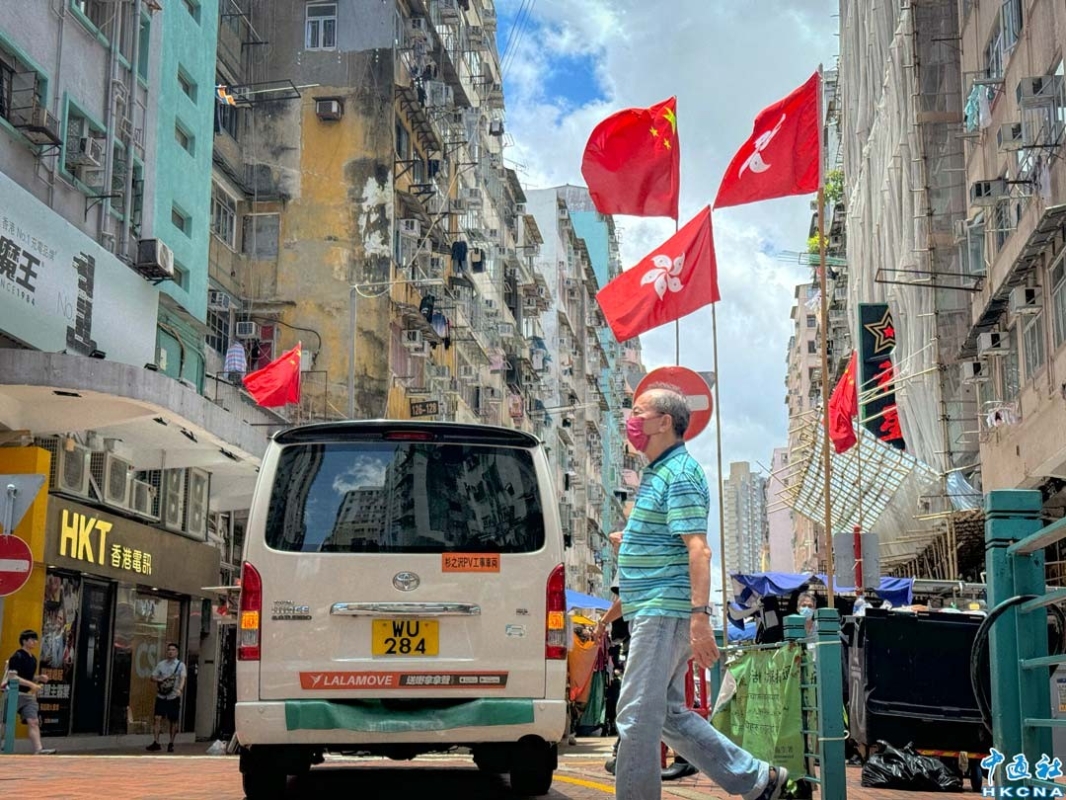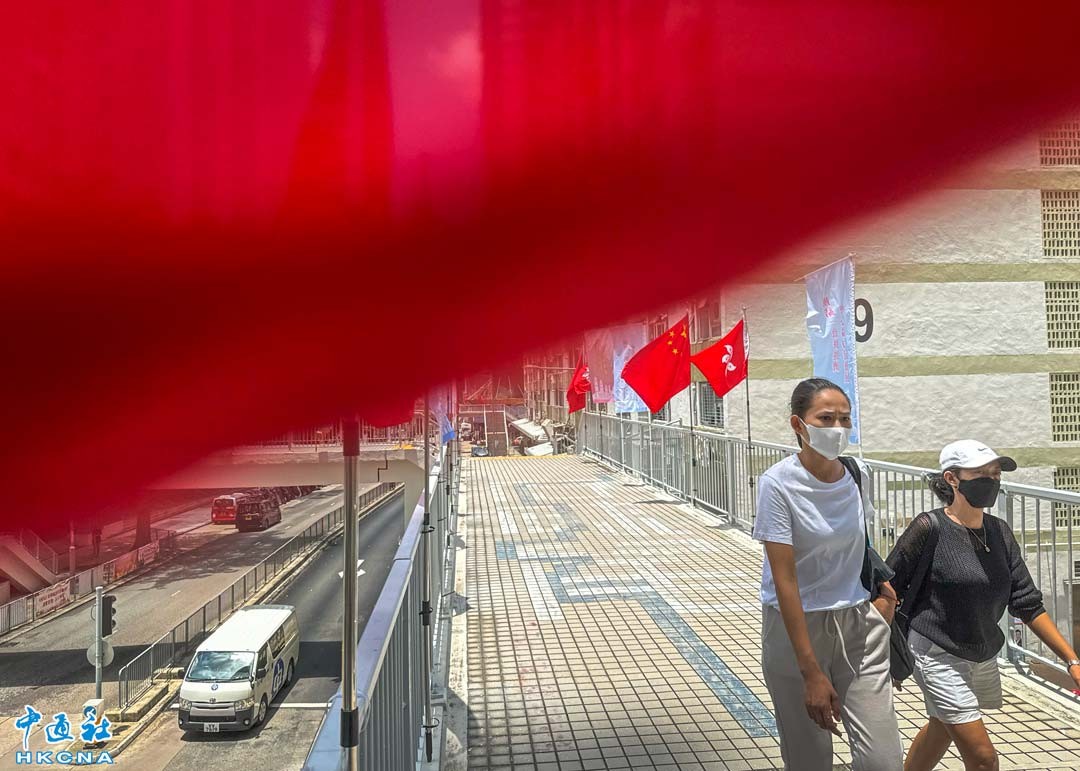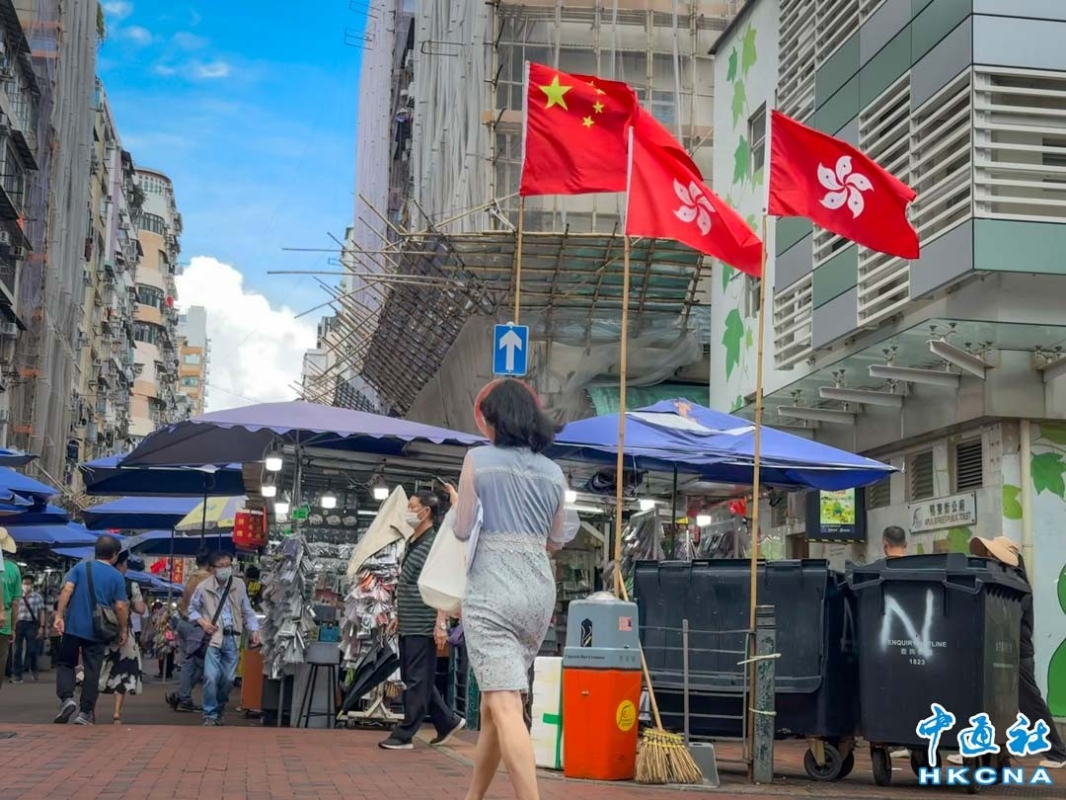 香港新聞網7月1日電(記者徐文峰)7月1日,香港深水埗大街上掛滿中華人民共和國國旗和香港特區區旗,一片喜氣洋洋,慶祝香港回歸祖國27週年。