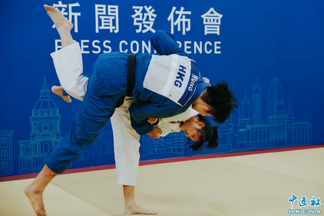6月25日,經過持續兩年的奧運排名賽,香港柔道隊運動員王嘉莉以亞洲女子第七的排名,躋身巴黎奧運舞台。這是繼2012年倫敦奧運後,香港再次成功取得柔道項目奧運參賽資格。26歲的王嘉莉將參加女子48公斤以下級別項目,目標是進入前七名。圖為王嘉莉與弟弟王嘉祺一起示範。(香港中通社記者 謝光磊 攝)