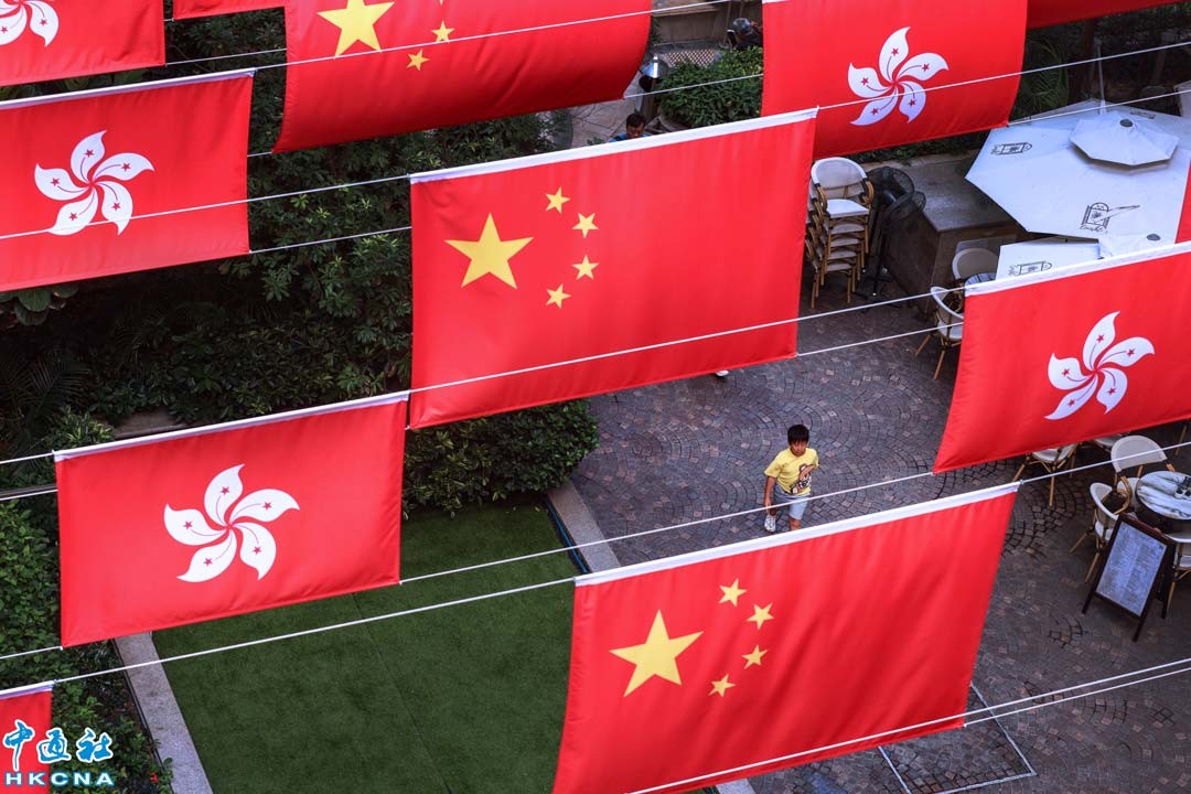 6月25日,香港灣仔利東街中庭上空飄揚著由上百面中華人民共和國國旗和香港特區區旗組成的“旗海”,慶祝香港特區成立27周年。(香港中通社記者 許其皓攝)