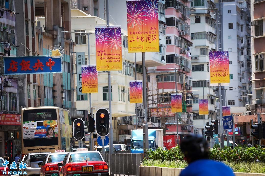 近日,香港全城裝飾一新慶祝回歸祖國27周年。6月26日,香港深水埗街頭掛滿慶祝回歸祖國27周年、特別行政區成立27周年的宣傳標語,為傳統舊區添一抹暖色,注入朝氣。(香港中通社記者 徐文峰攝)