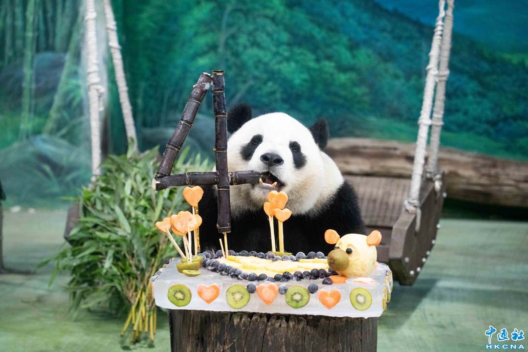 6月28日,台灣台北動物園大熊貓“圓寶”喜迎4歲生日,園方特別舉辦“圓寶4歲生日會”,準備的蛋糕主要以冰塊為基底,包含葡萄、奇異果、鳳梨、甘蔗,今年特別加入洋香瓜食材。香港中通社圖片