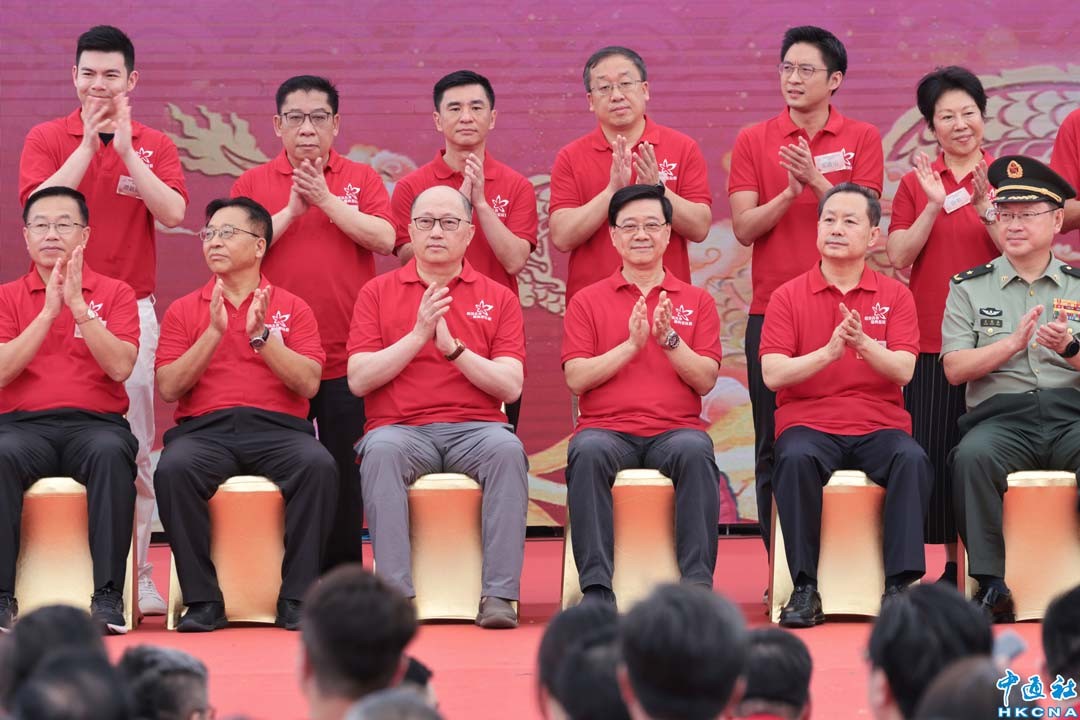 為慶祝香港回歸祖國27周年,香港各界慶典委員會將舉辦連串精彩慶祝活動,讓廣大市民及旅客共慶回歸喜悅,凝聚家國情懷。6月29日,“慶祝香港回歸祖國27周年”活動啟動禮在維多利亞公園舉行,為系列活動拉開帷幕。圖為香港特區行政長官李家超、中央駐港聯絡辦公室主任鄭雁雄等嘉賓出席啟動儀式。(香港中通社記者 謝光磊攝)