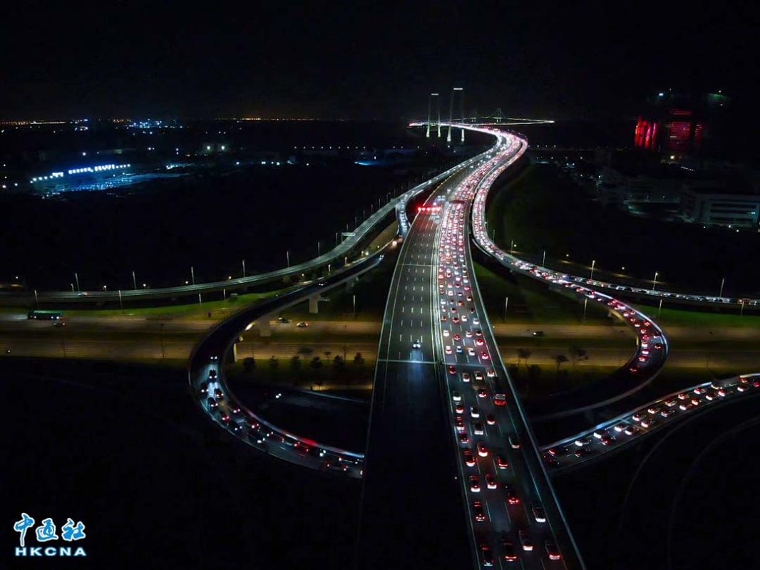 6月30日,深中通道歷時7年建成開通,是全球首個集“橋、島、隧、水下互通”為一體的跨海集群工程。通車後,深圳至中山的車程從約2小時縮短至30分鐘。圖為深中通道夜景璀璨。(香港中通社記者 孫晉欣攝)