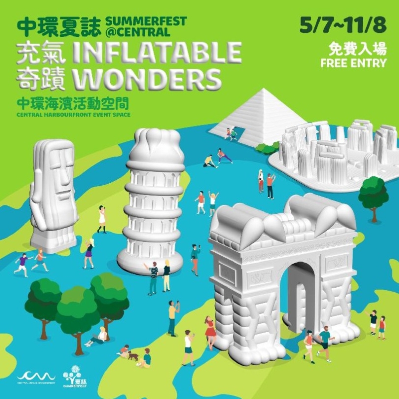一年一度的“SummerFest 中環夏誌”7月5日至8月11日在中環海濱活動空間舉行。 多個巨型充氣世界奇觀近日已現身場內,包括“智利復活節島摩艾石像”、“埃及吉薩金字塔”、“英國巨石陣”、“意大利比薩斜塔”及“法國凱旋門”,其中最巨型的裝置高達13米,晚上會發出不同顏色,當中“英國巨石陣”更是充氣彈床,可讓小朋友在巨石陣上跳跳彈彈。
