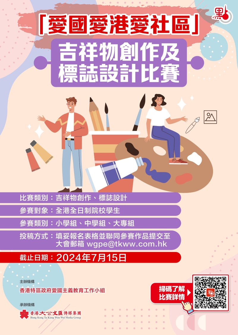 香港新聞網7月5日電 適逢中華人民共和國成立75周年,香港回歸祖國27周年,香港特區政府“愛國主義教育工作小組”舉辦吉祥物創作及標誌設計比賽,以增強全港學生的愛國意識和情懷。比賽截稿日期為7月15日,已踏入徵稿倒計時,歡迎全港中、小學和大專院校學生踴躍參與。 “愛國愛港愛社區”吉祥物創作及標誌設計比賽以“愛國愛港愛社區”為主題,由“愛國主義教育工作小組”主辦、香港大公文匯傳媒集團承辦。吉祥物創作及標誌設計這兩個比賽類別各設小學組、中學組和大專組,每組設冠、亞、季軍各一名和優異奬一名。所有得獎者將獲贈證書,冠、亞、季軍得主更將獲得香港故宮文化博物館年票。參賽者可參加多於一個比賽類別,但每人就每個比賽類別只可遞交一份參賽作品。比賽表格可查看網站。