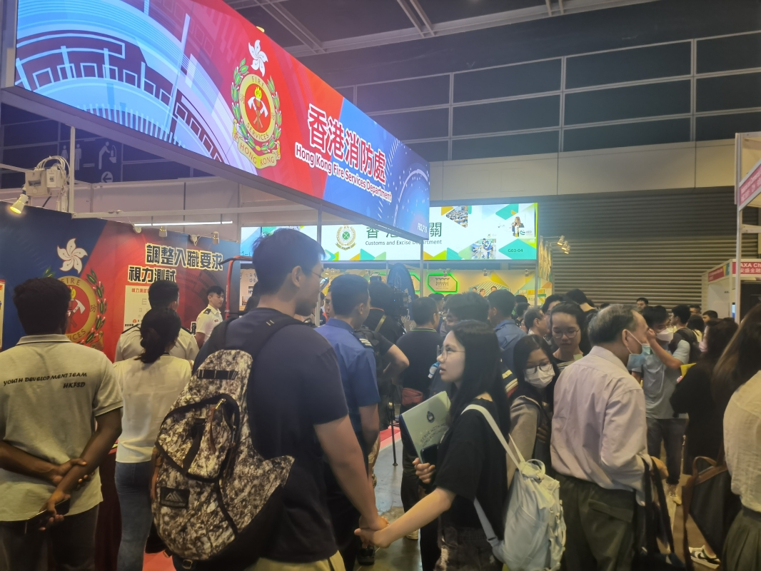 香港新聞網7月6日電 (記者 譚暢)由香港中華廠商聯合會主辦的香港國際教育及職業展6日在會展中心開幕。政府部門亦參展,而警隊、消防處、海關等攤位前人流不少,各種體驗很受歡迎。