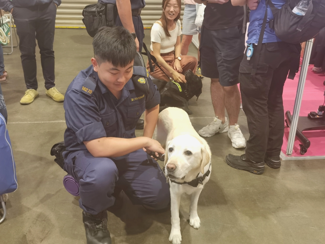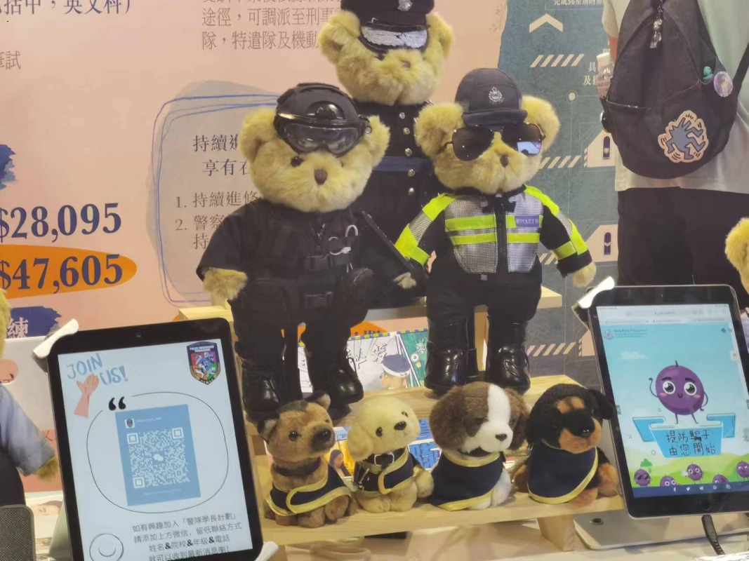 香港中通社圖片。 中通社記者在現場看到,政府相關部門的攤位附近人頭湧動,咨詢的市民一波接著一波。香港海關的攤位旁,有海關人員攜警犬出場展示,不少市民紛紛拍照;各攤位還設置互動環節,如肩膊肌力測試、夾娃娃機等,科普對人員體能的需求。在香港警務處的攤位上,還擺放著警察小熊,增添不少人文情懷。