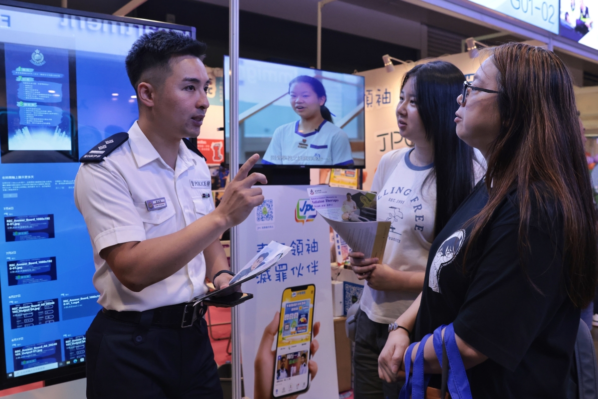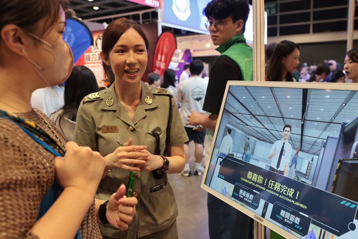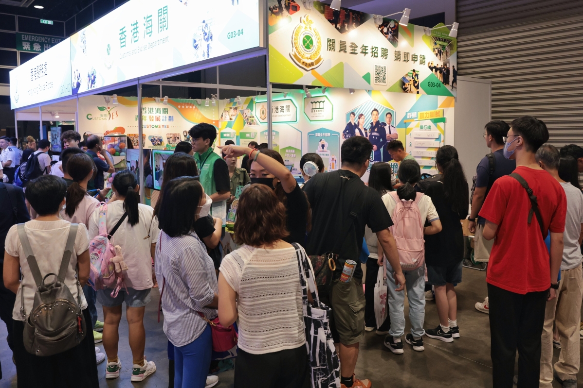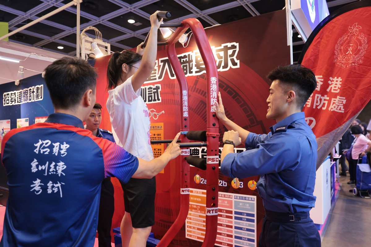 香港特區政府相關部門的攤位附近人頭湧動,各攤位還設置互動環節,如肩膊肌力測試等,科普對招聘人員體能的需求
