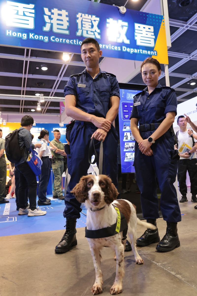 香港懲教署的攤位旁,有工作人員攜警犬出場展示,不少市民紛紛拍照