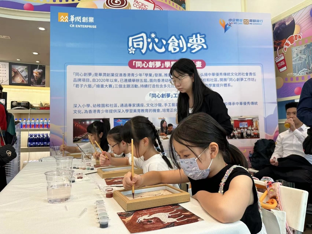 香港中通社記者 陳卓儀攝 主題門店舉辦啟動禮,同日開展敦煌文化藝術慈善公益課程,邀請来自敦煌的導師與學童現場體驗九色鹿填色繪畫,為社區內的青少年提供深入學習中華傳統美育教育的機會,提升文化認知和文化參與意識,培育正向價值觀。