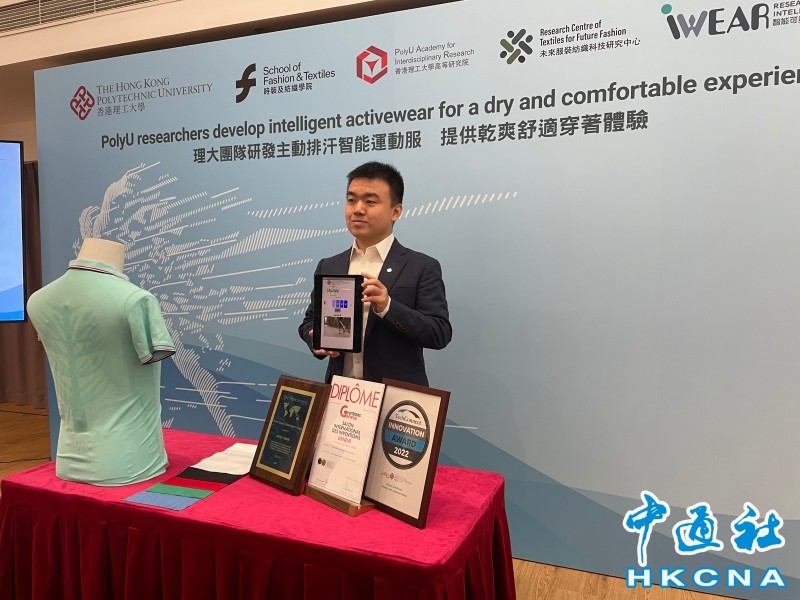 香港中通社7月10日電(記者 陳偉根)炎炎夏日做運動,衣服吸收大量汗液變得黏濕沉重。香港理工大學時裝及紡織學院副教授壽大華研究團隊10日介紹主動排汗智能運動服iActive,提供乾爽舒適的穿著體驗。