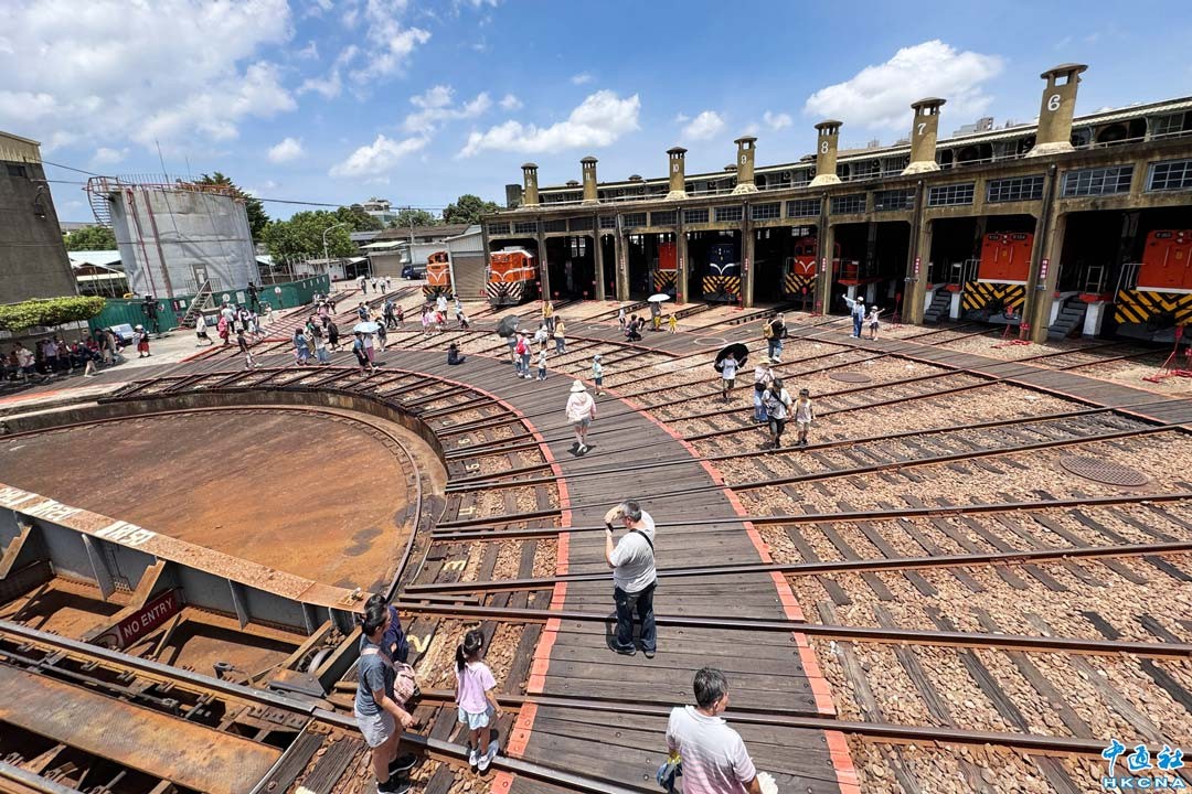 台灣民眾利用暑假到彰化著名的古蹟扇形車庫踏青,它也是台灣目前唯一一座動態保存的扇形車庫,也是著名的親子打卡景點。扇形車庫台灣碩果僅存的“火車頭旅館”。民眾走上觀賞台,從高處俯瞰整個扇形車庫的風貌,可見火車隨著正中央的360度調車轉盤緩緩旋轉,這個轉盤是火車進出的樞紐,緊接著12個股道,以半圓弧之姿朝車庫方向分散,搶眼的輻射狀線條,十分特殊。 香港中通社圖片