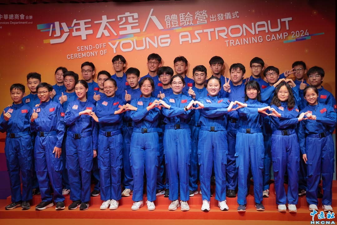 7月16日,“少年太空人體驗營2024”出發儀式在香港太空館舉行。由香港康文署與香港中華總商會合辦的“少年太空人體驗營2024”將於本月底舉行,30名香港中學生將前往北京、海南文昌及酒泉等地參與為期九日的訓練活動。圖為“少年太空人體驗營2024”學員。(香港中通社記者 謝光磊攝)
