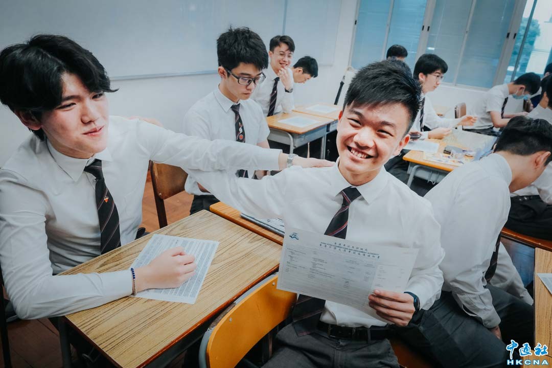 7月17日,香港中學文憑試(HKDSE)放榜。今年誕生10名狀元,分別是8男2女,他們考獲6科5**,並在首年推出的公民與社會發展科考獲“達標”成績,其中8人還在數學延伸部分取得5**,成為“超級狀元”。有兩名“狀元”來自喇沙書院,其中一人為“超級狀元”。圖為喇沙書院的“超級狀元”鐘栢綸(右)收到成績單後與同學一同慶祝。(香港中通社記者 許其皓攝)