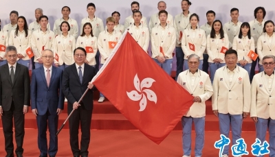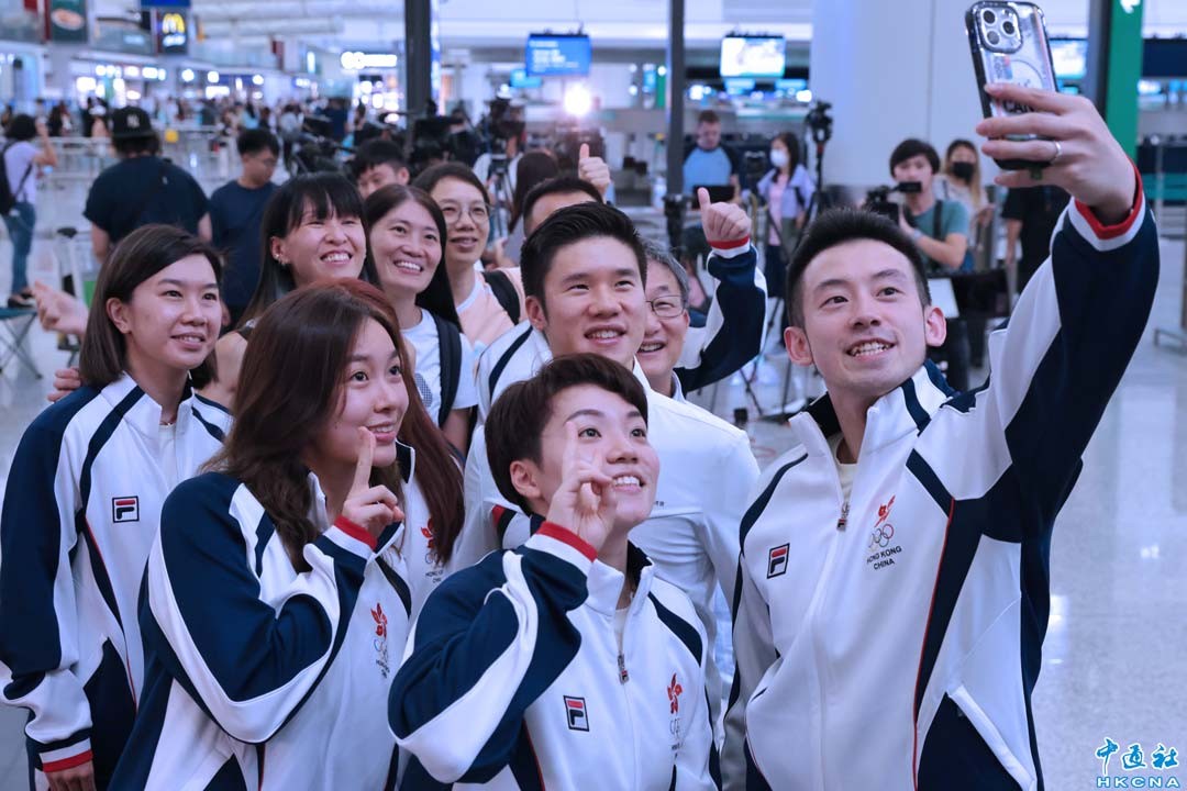 2024年巴黎奧運會將於7月26日(巴黎時間)揭幕。7月22日晚上,港協暨奧委會副會長兼巴黎奧運中國香港代表團團長施文信帶領游泳和乒乓球運動員及其團隊等人員,啟程前往法國巴黎。(香港中通社記者 謝光磊攝)