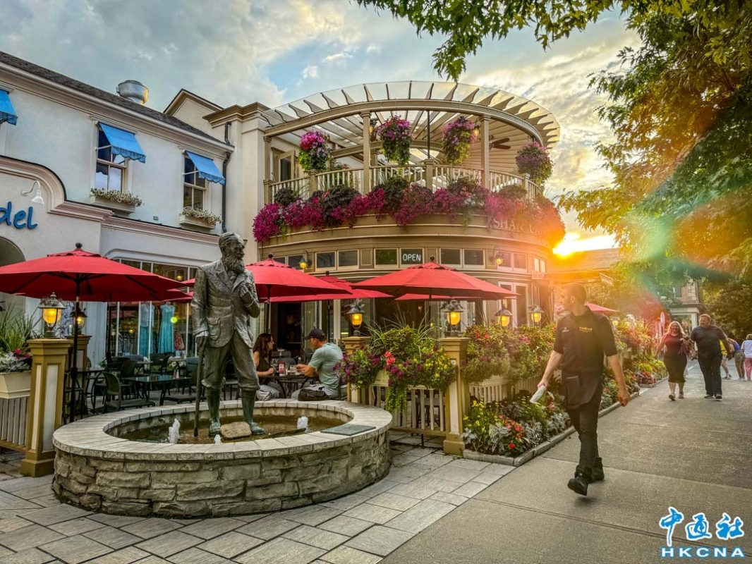 尼加拉湖濱小鎮(Niagara-on-the-lake)被譽為"加拿大最美小鎮",坐落於尼加拉河匯入安大略湖的入湖口西岸。大街兩旁的維多利亞式建築,恍似進入了電影場景中的小鎮,看看擺設優雅商店,在露天茶座看著馬車踱步,是體驗加拿大悠閒生活的極致。圖為落日餘暉影照下的露天茶座與愛爾蘭著名劇作家蕭伯納的塑像。(香港中通社記者 徐文峰攝)