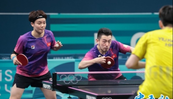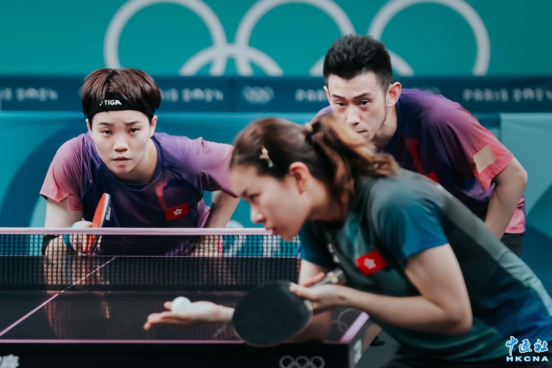 當地時間7月24日,中國香港乒乓球隊於巴黎奧運比賽場館進行適應場地訓練,球員讚揚場地漂亮及球枱有新鮮感,冀以最佳狀態作最後備戰。圖為中國香港乒乓球隊隊員杜凱琹、黃鎮廷在訓練中。(香港中通社記者 謝光磊攝)