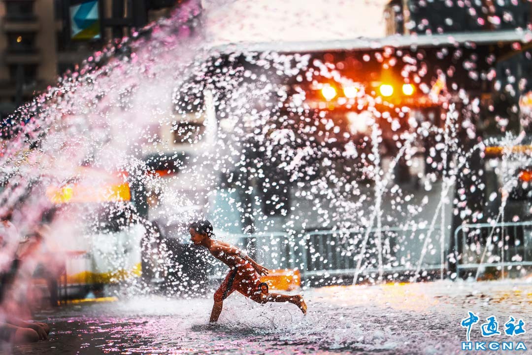 聯合國秘書長古特雷斯25日表示,剛剛過去的21日、22日和23日是有記錄以來最熱的三天,這一周出現的高溫現象史無前例。圖為加拿大的兒童在多倫多密西西加市政廳前的水池嬉水消暑。(香港中通社記者 徐文峰攝)