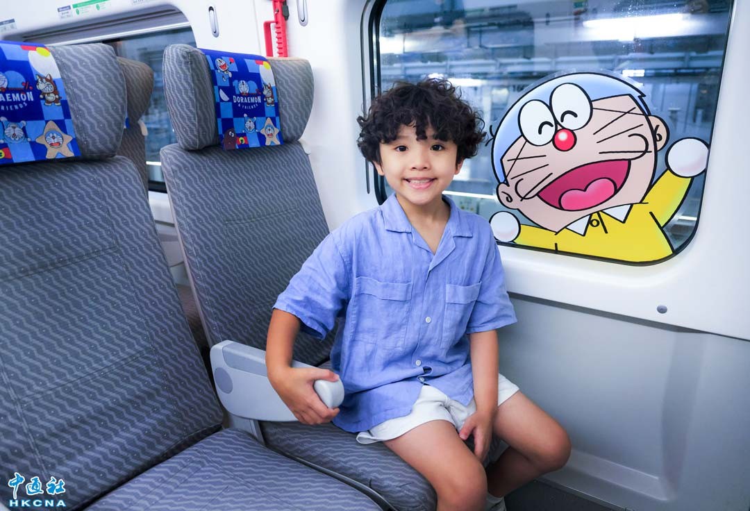 7月26日,港鐵公司與《100%多啦 A 夢 & FRIENDS》巡迴特展(香港)的主辦單位 AllRightsReserved 宣布,推出首列粵港跨境高鐵“100% 多啦A夢& FRIENDS”主題列車,由7月27日起接載旅客穿梭香港、深圳和廣州,主題列車車廂內外遍布50多款多啦A夢造型裝飾。(香港中通社記者 曹文毓攝)