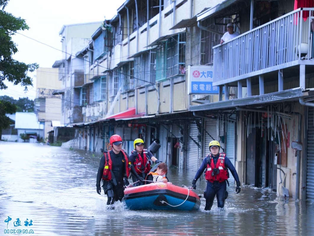 颱風“格美”26日清晨離開台灣,但超大豪雨造成嘉義縣多處淹水, 救護人員以橡皮艇載送物資、分送餐點給仍留在家中的居民,另協助有急迫需求的災民撤離淹水家園,送到安置點。 香港中通社圖片