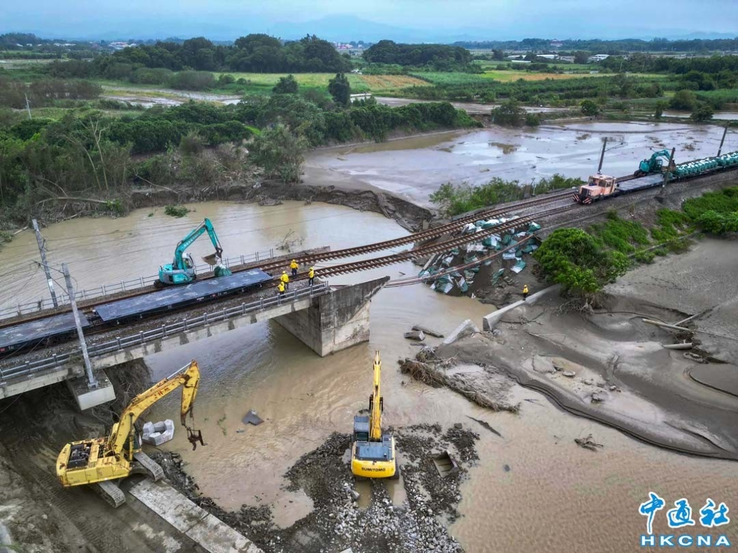 颱風“洛美”重創南部,台灣鐵路台南新營到嘉義路段因八掌溪橋南側土堤受到溪水暴漲影響,路基遭沖刷掏空約30公尺,目前停駛,持續改以公路接駁,預計最快8月1日才能搶通東正線單線雙向運行。 香港中通社圖片