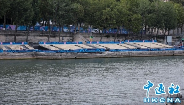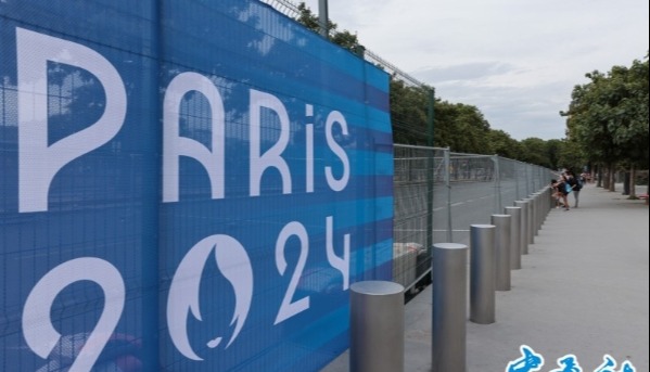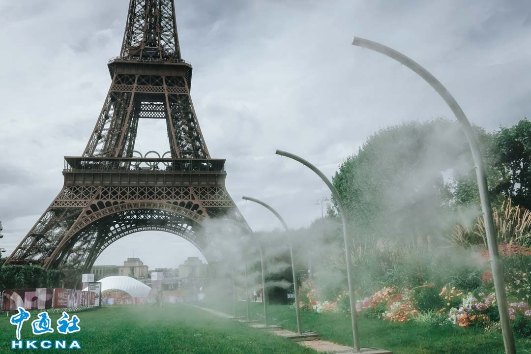 當地時間7月25日,距離第三十三屆夏季奧運會在巴黎開幕只剩1天時間,當日天氣炎熱,埃菲爾鐵塔體育場內噴水霧降溫。(香港中通社記者 謝光磊攝)