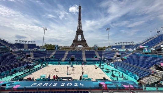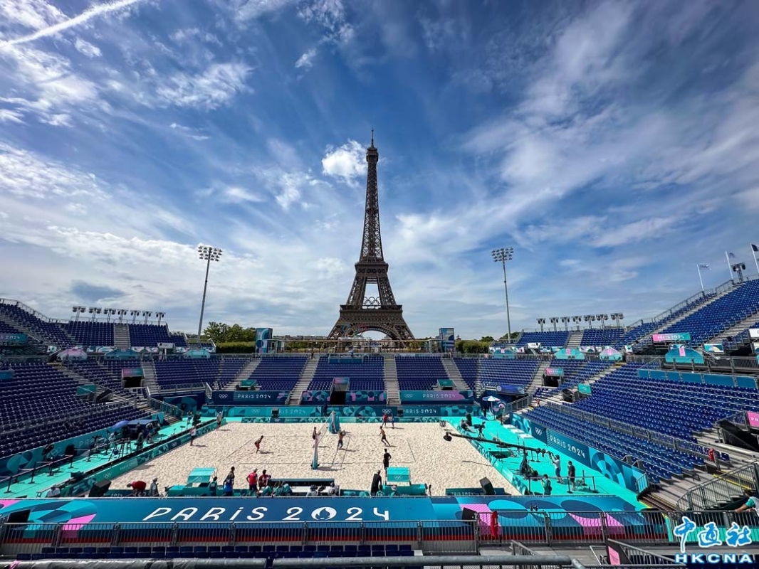 當地時間7月25日,法國巴黎埃菲爾鐵塔體育場,沙灘排球運動員在場上訓練。埃菲爾鐵塔體育場位於巴黎戰神廣場,2024年巴黎奧運會將在這里舉行沙灘排球項目的比賽,因為位置正對埃菲爾鐵塔,使之成為巴黎奧運最受關注的場館之一。(香港中通社記者 謝光磊攝)