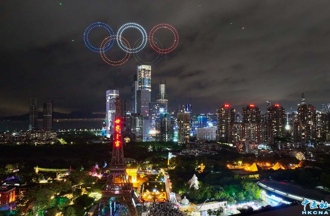7月28日晚,世界之窗500架無人機表演點亮深圳夜空,表演以“巴黎奧運”為主題,融合奧運五環、火炬手以及“中國隊加油”等元素,為奧運加油。(聞子 攝)