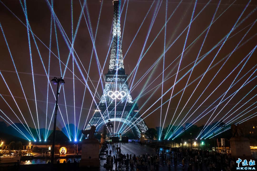 當地時間7月26日,第33屆夏季奧林匹克運動會開幕式在法國巴黎舉行。圖為開幕式進入尾聲,埃菲爾鐵塔光芒四射,上演震撼光影秀。(香港中通社記者 謝光磊攝)