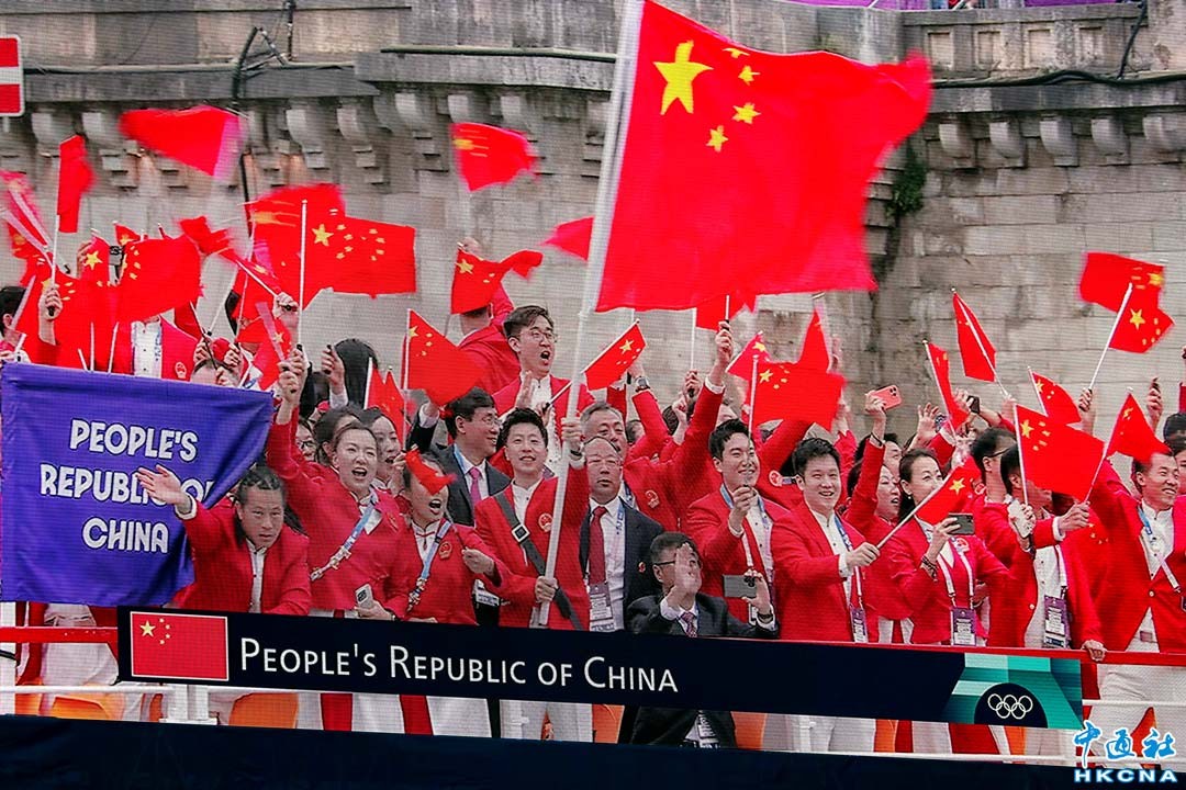 當地時間7月26日19點30分起,第33屆夏季奧林匹克運動會在法國首都巴黎舉行了約4小時開幕式,200多個國家和地區代表團乘坐85艘船隻沿塞納河入場,還舉行了河岸文藝匯演及本屆奧運主火炬點燃儀式。圖為中國隊入場。(香港中通社記者 謝光磊攝)