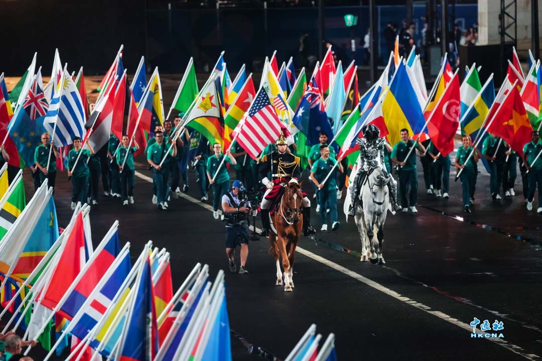 當地時間7月26日,第33屆夏季奧林匹克運動會開幕式在法國巴黎舉行。圖為各代表團旗幟進入特羅卡德羅廣場會場。(香港中通社記者 謝光磊攝)