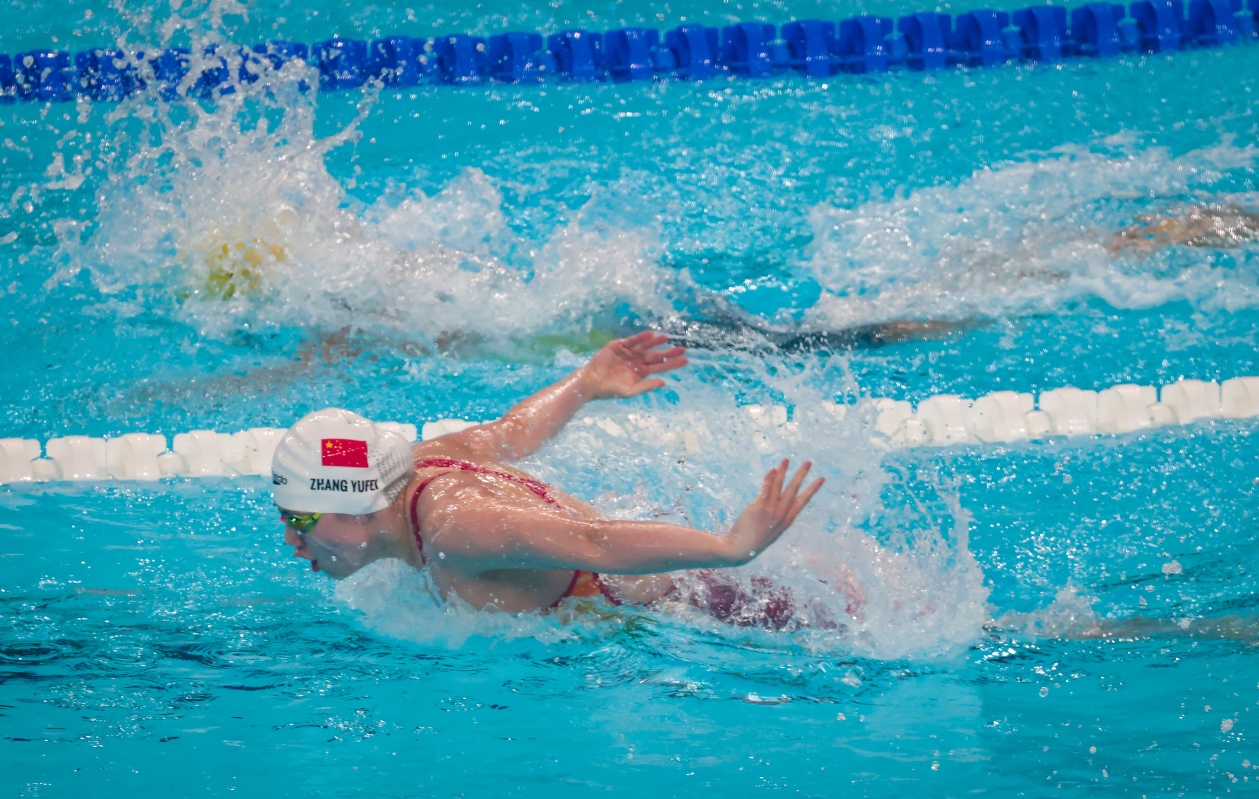 當地時間7月27日,巴黎奧運會游泳項目女子100米蝶泳半決賽在法國巴黎拉德芳斯體育館舉行,中國選手張雨霏以56秒15獲得小組第二,成功晉級決賽。(香港中通社記者 謝光磊攝)