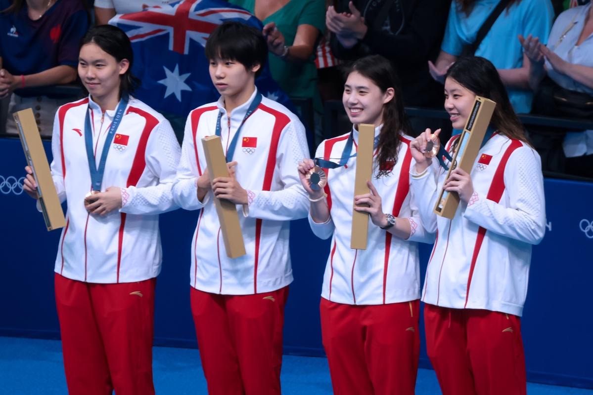 當地時間7月27日,中國隊選手楊浚瑄、程玉潔、張雨霏、吳卿風(從左至右)在頒獎儀式上。她們以3分30秒30的成績獲得季軍并打破亞洲紀錄。 當日,巴黎奧運會游泳女子4X100米自由泳接力決賽在拉德芳斯體育館舉行。(香港中通社記者 謝光磊攝)