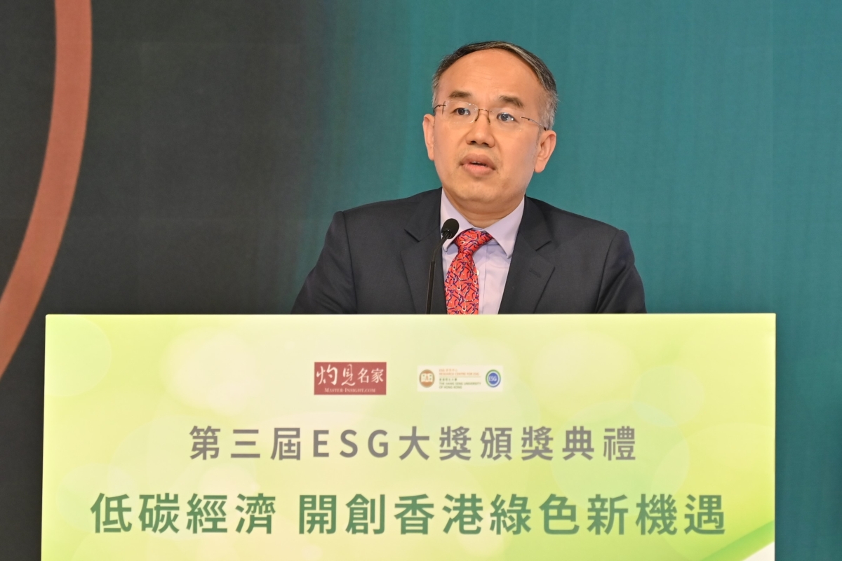 圖源:灼見名家。 氣候暖化日趨嚴重 感謝企業盡一分力 灼見名家傳媒社長文灼非先生表示,灼見名家邁向10周年,今年ESG大獎難得移師至港交所舉行頒獎典禮,而報名公司及機構數量也破紀錄。有賴專業的評審團隊、協辦及支持機構,活動才得以成功舉行,謹此致謝。他指出,氣候暖化現象不斷惡化,今年異常天氣的日子特別多,感謝得獎機構不懼困難、致力於ESG工作,紓緩氣候危機,並不吝提供資料以供評審,形容ESG大獎並不容易獲取,恭喜所有得獎者。 評審委員會主席、香港恒生大學何善衡博士銀行及金融學教授暨ESG研究中心主任鄭子云博士形容,ESG大獎可媲美奧運會的獎項。坊間雖不乏相關主題的獎項,但這次活動所需資源亦不少,評審過程十分嚴格,可見其素質之高。在座得獎者都值得給自己掌聲。 許正宇:綠色融資需求大 市場產品應變迅速 主禮嘉賓、財經事務及庫務局局長許正宇先生相信,大家都對極端高溫天氣有深切體會。他引用世界氣象組織數據,表示2023年為有紀錄以來最熱的年份,海洋熱量、海平面上升和南極海冰消融均打破紀錄,而極端天氣也阻礙社會經濟發展。同時,環球市場對於綠色金融需求甚大,估計達到2030年,全球每年氣候投資需要達到9萬億美元。而截至今年3月底,香港共有224個獲證監會認可ESG基金,資產管理規模超過1700億美元,基金數目及資產規模比去年同期分別增長近兩成和逾一成,可見金融市場應變得很快,推出相應產品配合綠色融資需求。