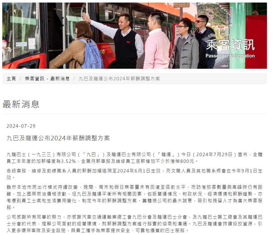 香港新聞網7月29日電 香港九巴及龍運巴士29日宣布,全體員工本年度加薪幅度為3.52%,全職月薪車務及維修員工底薪增加不少於800港元。各級車務、維修及前線職系人員的薪酬加幅追溯至2024年6月1日生效,文職人員及其他職系將會在今年9月1日生效。
