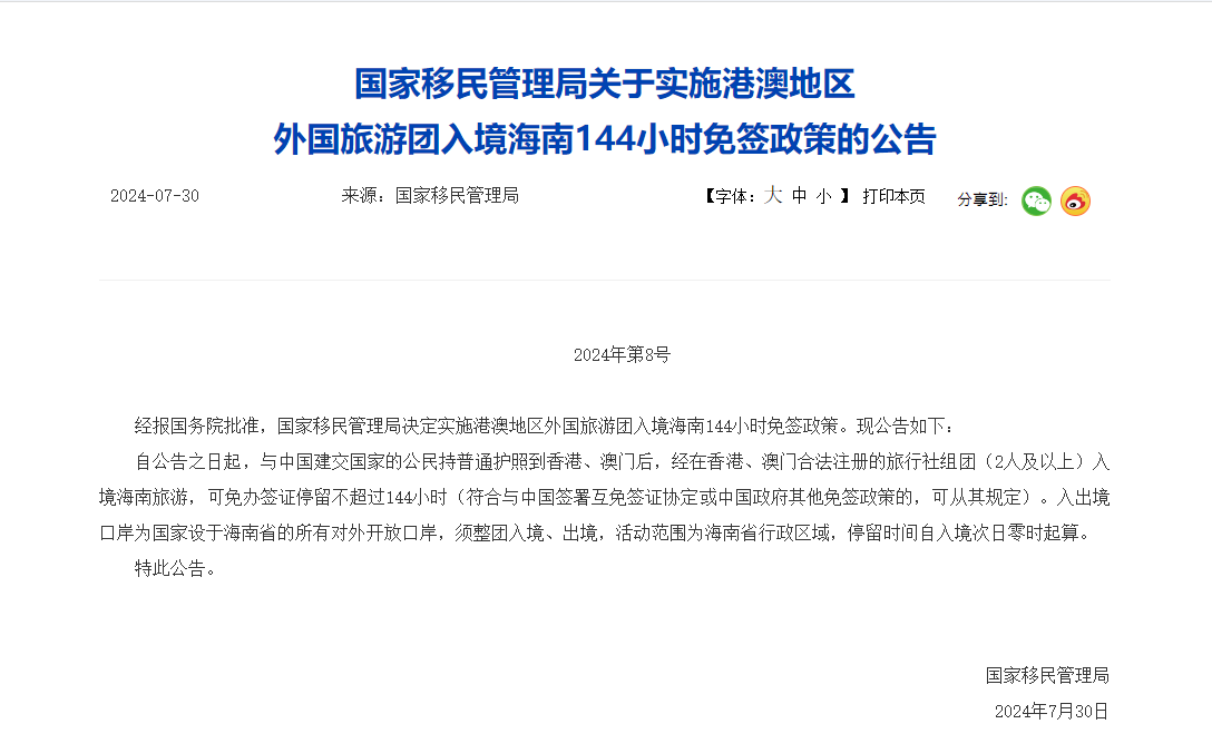 香港新聞網7月30日電 國家移民管理局30日發布公告,自2024年7月30日起,實施港澳地區外國旅遊團入境海南144小時免簽政策。與中國建交國家的公民持普通護照到香港、澳門後,經在香港、澳門合法註冊的旅行社組團(2人及以上)入境海南旅遊,可免辦簽證停留不超過144小時(符合與中國簽署互免簽證協定或中國政府其他免簽政策的,可從其規定)。入出境口岸為國家設于海南省的所有對外開放口岸,須整團入境、出境,活動範圍為海南省行政區域,停留時間自入境次日零時起算。