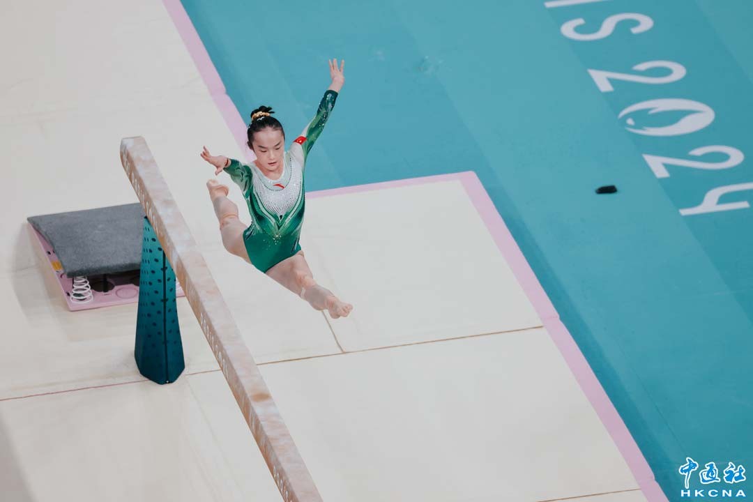 當地時間8月5日,在巴黎奧運會體操女子平衡木決賽中,中國選手周雅琴獲得銀牌。(香港中通社記者 謝光磊攝)