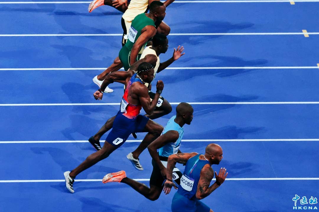 當地時間8月4日,巴黎奧運會田徑男子100米決賽在法蘭西體育場舉行。美國選手萊爾斯獲得冠軍。圖為比賽現場。(香港中通社記者 謝光磊攝)