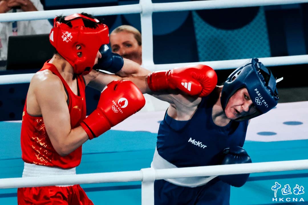 當地時間8月6日,在巴黎奧運會拳擊項目女子60公斤級決賽中,中國選手楊文璐不敵愛爾蘭選手哈靈頓,獲得銀牌。(香港中通社記者 謝光磊攝)
